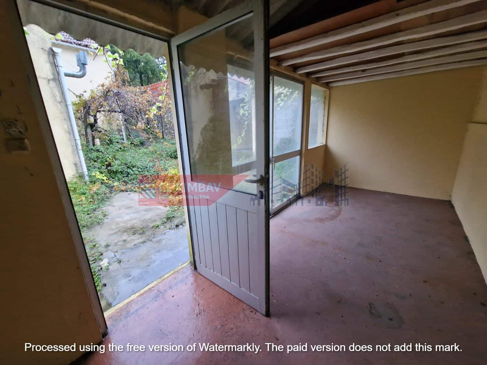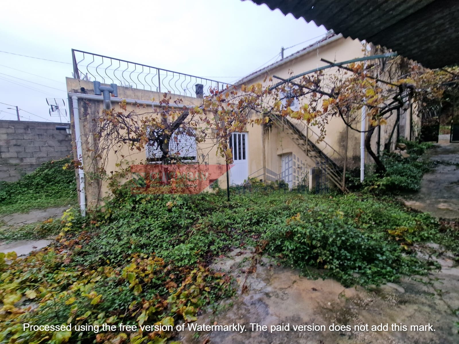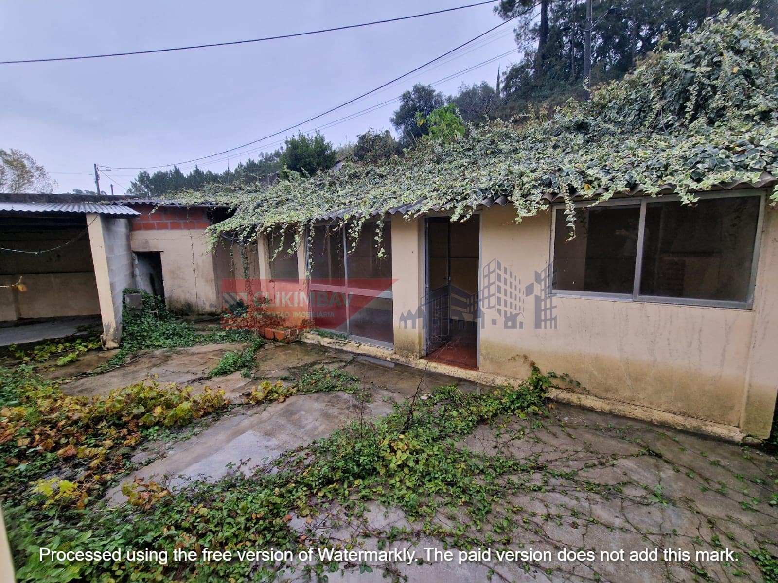 Conta também com um espaço exterior que inclui garagem e anexos ou arrumos.